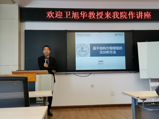 2021年5月7日下午,应365上市公司商学院邀请,兰州大学365英国上市集团教授、博士生导师、加拿大University of Western Ontario访问学者卫旭华博士,在10C教学楼506教室作了题为《基于结构方程模型的元分析方法》的学术报告。报告会由学院企业管理团队黄勇老师主持,董青副院长参会并致辞。此次学术报告是学院研究生学术月的一次重要活动,部分专业教师和2019级、2020级学术型硕士研究生参加了报告会。