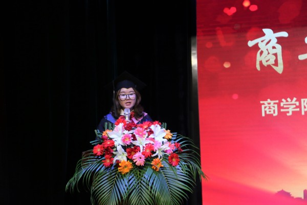 2017级物流管理班何春贵作为本科生毕业生代表发言。何春贵首先感谢曾经教导、陪伴和帮助自己的师长和亲友们。在奔向人生下一站之际她分享了自己的期待:“让我们牢记学校的嘱托,老师的教诲,秉承‘知术欲圆,行旨须直’的校训,‘弘道求是,知术乐商’的院训努力前行。‘士不可以不弘毅,任重而道远’,以时间为证,我们一定会成为拥有理想并富有智慧的人,德才兼备并勇于创新的人,富有责任并敢挑重担的人。在明天的舞台上,乘风破浪,挥斥方遒。”