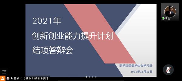 11月13日晚,商学院2021年大学生“创新创业能力提升计划”结项答辩会在线上举办。学院黄勇老师、李承晋老师、史煜娟老师、马兰老师等到会指导并担任评委,学院师生共计100余人参加。
