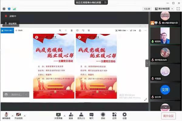 11月19日,学院依托信息管理学生党支部,举办了“战役党旗飘,就业暖心帮”线上主题党日活动,商学院党委副书记、副院长杨国科做了主题发言,支部书记、辅导员、学生党员、毕业生代表共计50余人参加了活动。