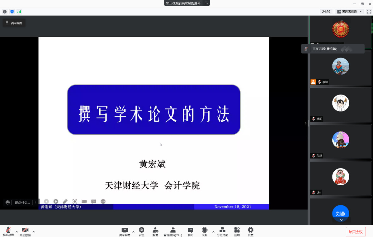 2021年11月18日,应学院邀请,天津财经大学会计学院教授、博士生导师黄宏斌为我院师生作了题为《撰写学术论文的方法》学术报告。报告由会计系杨阳老师主持,学院领导、专任教师及研究生共100余人在线聆听了报告。
