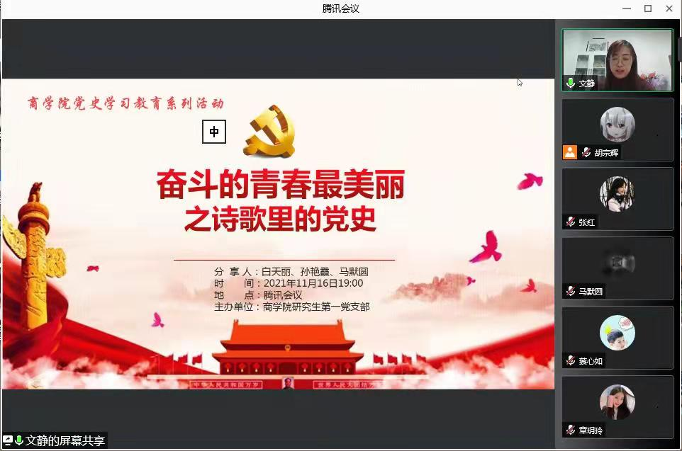 为庆祝中国共产党成立100周年,由商学院研究生第一党支部举办的“奋斗的青春最美丽”之诗歌里的党史”主题党日活动于2021年11月16日以腾讯会议的形式展开。