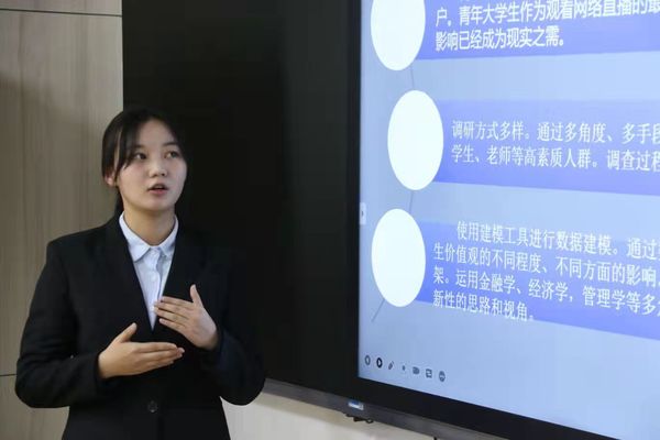 答辩会上,立项答辩人借助PPT展示,详细介绍申报项目的选题背景、立项依据、实施方案和预期成果。评委老师围绕项目计划书存在的问题、项目研究的可行性发展等展开提问,结合学生困惑针对性提出指导意见。