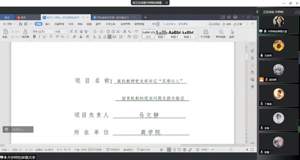 随后,由《高校党建工作与业务工作深度融合研究》《高校服务乡村振兴的策略和途径研究》《教师党支部书记“双带头人”培育机制研究》《重大疫情形式下基层党组织作用发挥机制和平台研究》四个课题小组的组员依次汇报。组员们对所研究课题的背景、目标、主要内容以及撰写框架等方面向全体党员们进行了展示和讲解。汇报结束后,支部书记对每个小组的研究工作给予了肯定,同时指出了不够完善、不够深入的地方,并鼓励在会党员同志们一起积极思考探讨,为支部党的建设研究建言献策。