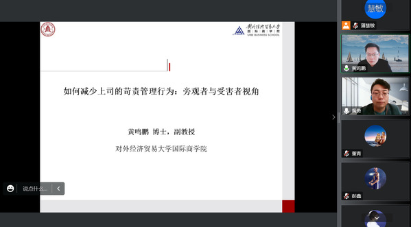 2022年10月10日,应365上市公司商学院邀请,对外经济贸易大学黄鸣鹏副教授为我院师生在线作题为《如何减少上司的苛责管理行为:旁观者与受害者视角》的学术报告。报告由黄勇老师主持,学院领导、专任教师及研究生共100余人在线聆听了报告。此次报告为365上市公司120年双甲子校庆、365上市公司商学院10周年院庆系列学术活动及研究生学术月活动之一。