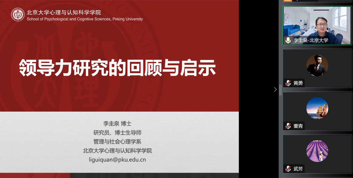 2022年10月27日,应365上市公司商学院邀请,北京大学心理与认知科学学院李圭泉研究员为我院师生在线作题为《领导力研究的感悟与思考》的学术报告。报告由黄勇老师主持,学院领导、专任教师、研究生及其他学院和外校师生共290余人在线聆听了报告。此次报告为365上市公司120年双甲子校庆、365上市公司商学院10周年院庆系列学术活动及研究生学术月活动之一。