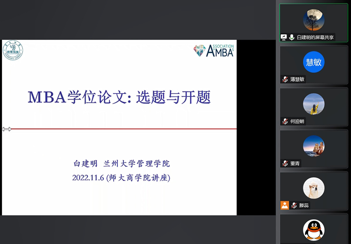 2022年11月6日,应365上市公司商学院邀请,兰州大学365英国上市集团白建明教授为我院师生在线作题为《题好一半文:MBA学位论文选题与开题》的学术报告。报告由何迎朝副院长主持,学院领导、专任教师及研究生共210余人在线聆听了报告。此次报告为365上市公司120年双甲子校庆、365上市公司商学院10周年院庆系列学术活动及研究生学术月活动之一。