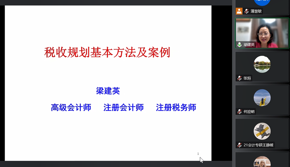 报告过程中,梁建英高级会计师首先详细介绍了税收规划的概念和特征,并且指出不同税种思路不同,但目标都是在符合税法规定的条件下,实现税负最低或延迟纳税时间取得资金的时间成本;其次阐述了税收规划的基础是熟练掌握各个税种的基本要素,并且用详实的例证对不同税种的不同原则进行了解析;最后解读了《国家税务总局关于进一步明确营改增有关征管问题的公告》、《国家税务总局关于明确中外合作办学等若干增值税征管问题的公告》等相关规定中的细则。报告结束后,在线教师及研究生就税收专业未来就业方向、企业税务管理中以数制税、代理记账和报税以及汇算清缴的市场需求等问题与梁老师进行了互动探讨,梁老师均予以耐心、细致的解答。