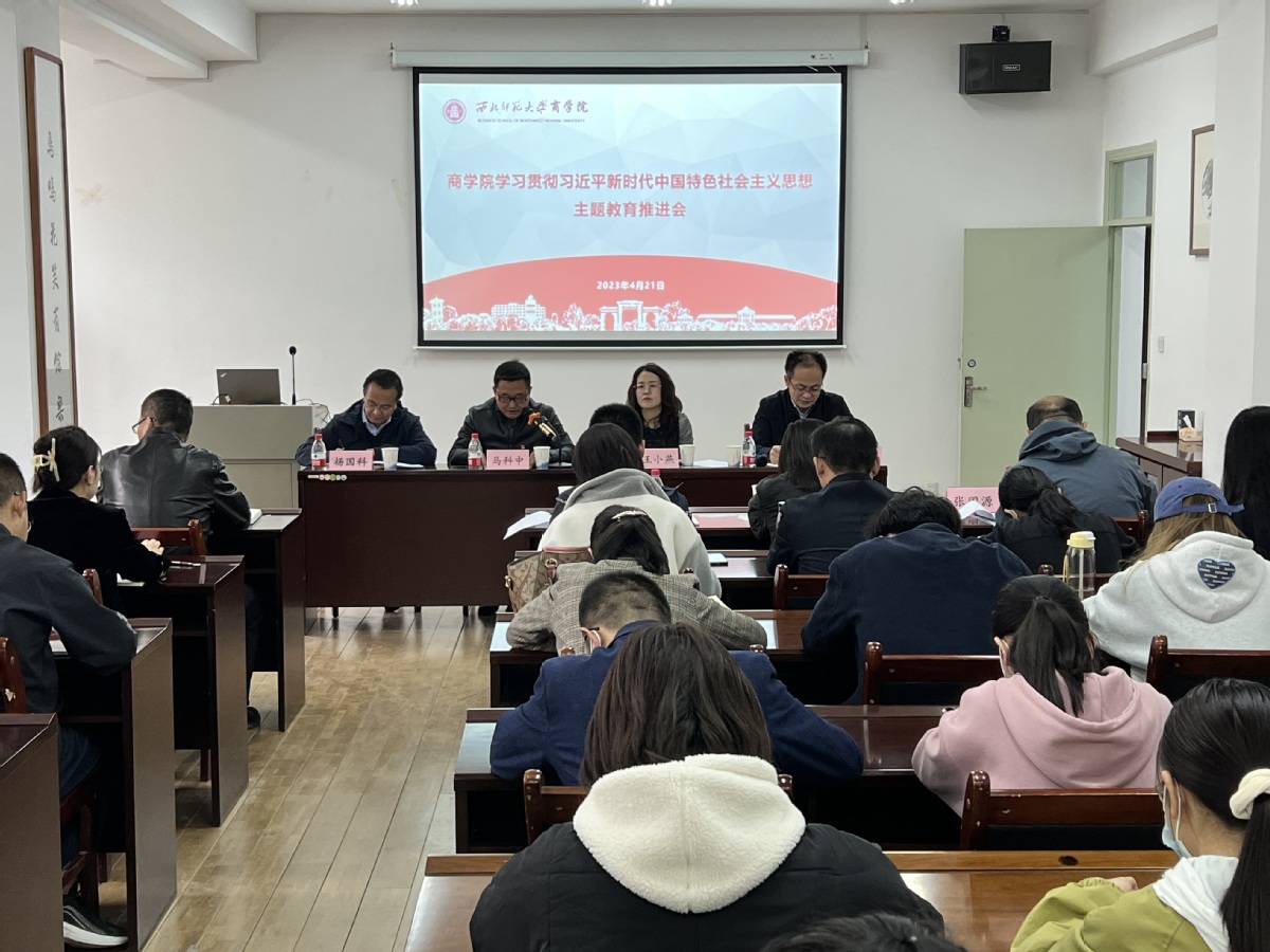 2023年4月21日上午,商学院召开学习贯彻习近平新时代中国特色社会主义思想主题教育推进会,学校主题教育第四巡回指导组副组长王小燕一行4人到会指导。学院领导班子成员,党委委员,支部书记,系(所)中心主任,师生党员共80余人参加会议,学院院长董青同志主持会议。