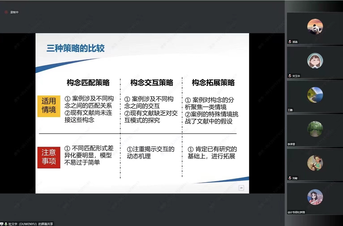 杜文宇副教授认为理论构建是案例研究的一个关键步骤,这个过程需要将数据与理论构念反复磨合,以构建一个既能解释案例现象、又能拓展已有理论的模型。模型构建也是案例研究的一个重要挑战,其常见的问题包括:模型与理论实现了匹配,但丧失了案例特色;模型反映了案例特色,但理论贡献不清晰等。面对这些常见挑战,杜文宇副教授结合自身在IT外包领域的案例研究经验,提出了构念匹配、构念交互、构念拓展三种理论策略,并分析了不同策略的适用情境和注意事项。报告结束后,在线教师及研究生就案例选择标准、如何快速根据案例精准找到对话的文献、拓展策略的具体实施等问题与杜老师进行了互动探讨,杜老师均予以耐心、细致的解答。