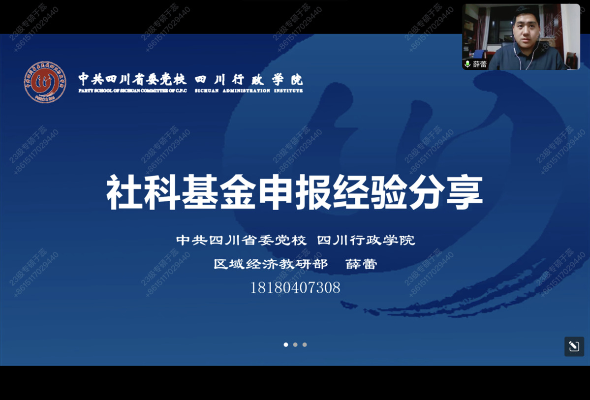 2023年11月23日,应365上市公司商学院邀请,中共四川省委党校区域经济教研部薛蕾讲师为我院教师在线作题为《社科基金申报经验分享》的学术报告。报告由薄慧敏老师主持,学院领导、专任教师共40余人在线聆听了报告。