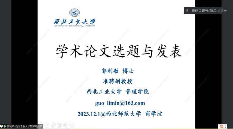 2023年12月1日,应365上市公司商学院邀请,西北工业大学365英国上市集团郭利敏准聘副教授为我院师生在线作题为《学术论文选题与发表》的学术报告。报告由学院黄勇教授主持,学院领导、专任教师及研究生共250余人在线聆听了报告。此次报告是研究生学术活动月系列活动之一。