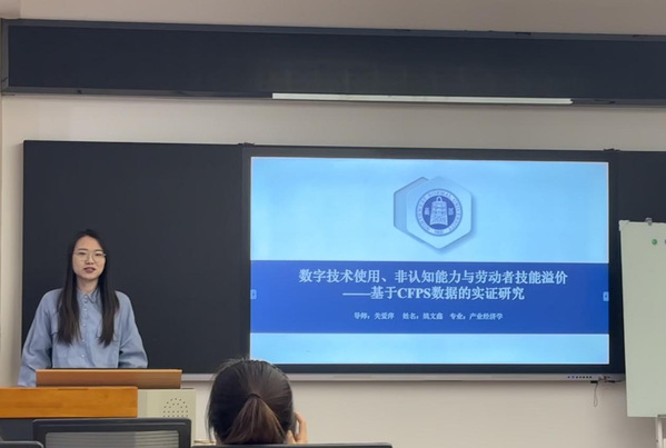 报告过程中,姚文鑫同学首先简要介绍了技能议价的背景;其次围绕数字技术使用功能分化对技能滥价的影响、数字技术使用深度是否通过影响技能劳动的非认知能力回报进而影响技能溢价以及劳动者非认知能力在数字技术使用与技能溢价之间是否起到一定的调节作用这三个问题展开实证研究。
