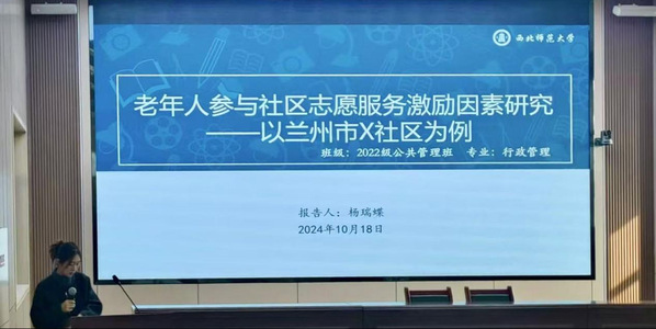 杨瑞蝶同学的研究发现:随着我国进入中国特色社会主义新时代,社区志愿服务正面临着新的发展机遇和挑战。国家政策明确支持社会工作服务机构和志愿服务组织的发展,鼓励壮大志愿者队伍,并推进志愿服务制度化。然而,在实践中,社区志愿服务仍存在诸多困境,如参与意愿不高、资源匮乏等。在此背景下,老年人作为社区志愿服务的重要力量,其参与状况及激励机制的研究显得尤为重要。因此,她基于积极老龄化理论、马斯洛需求层次理论和双因素理论,并通过对兰州市X社区的实践调查,探讨分析了目前老年人参与社区志愿服务的参与意愿高但参与率低等问题及激励现状。同时,她还从政府激励因素、志愿者组织内部激励因素、志愿者自我感知受益因素和社会环境激励因素等方面分析了对老年人参与社区志愿服务的激励作用。