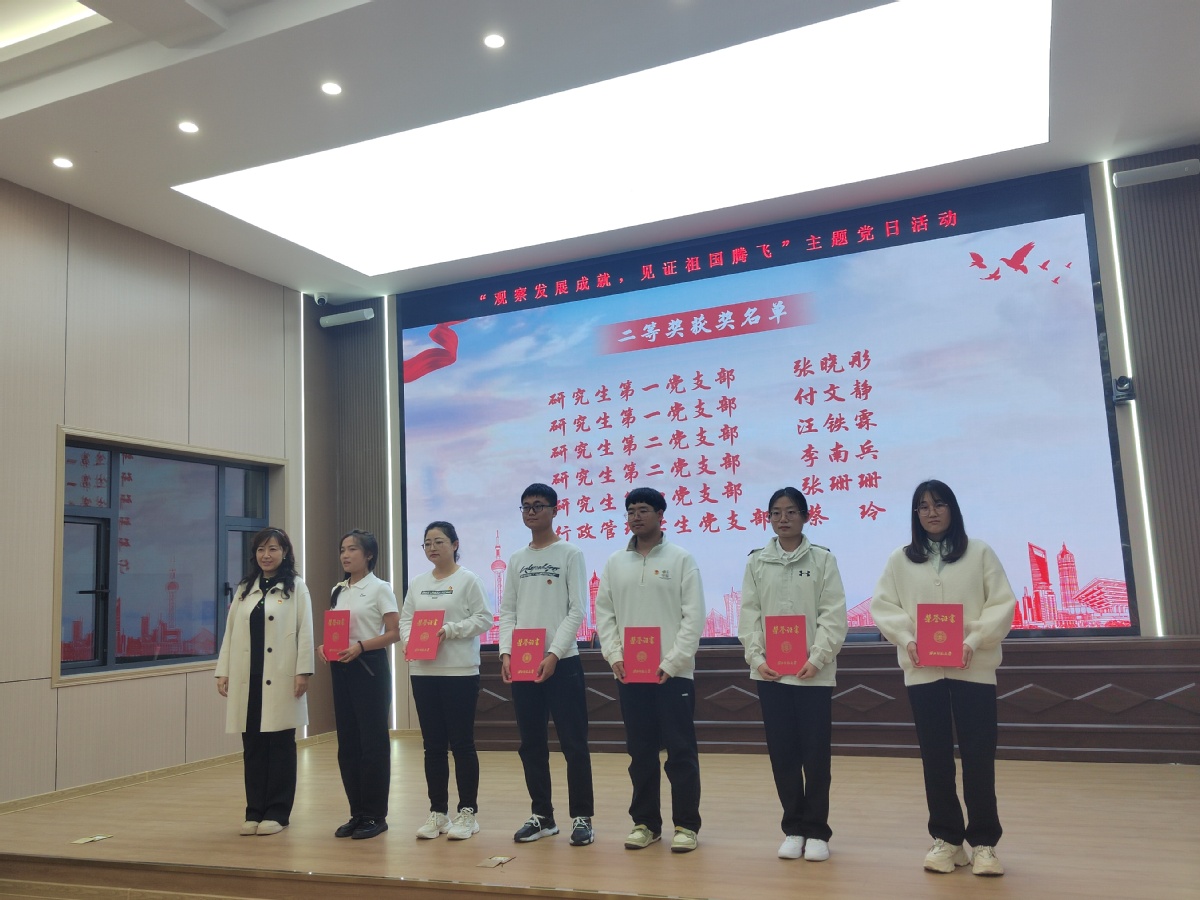 随后,举行了主题作品征集颁奖仪式。研究生第一党支部书记马文静同志为一、二、三等奖获奖作品和优秀组织奖颁奖并合影。本次主题作品征集活动得到了广大党员和入党积极分子的积极响应,共收到了众多优秀作品。经过严格评选,最终评选出一等奖6人,二等奖6人,三等奖12人,优秀组织奖:研究生第一党支部、研究生第二党支部、研究第三党支部、研究生第四党支部。颁奖仪式上,马文静同志对获奖个人和党支部表示了热烈祝贺,并鼓励大家继续努力,为祖国的发展贡献自己的力量。