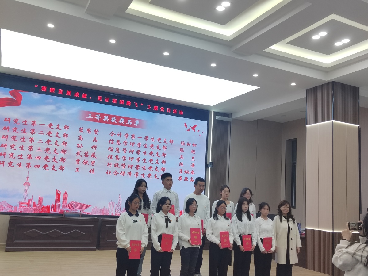 紧接着,在“我眼中的祖国发展成就” 环节,各个学生党支部选派的同志们纷纷登台,通过 PPT 展示、演讲等形式,分享了自己眼中祖国的发展成就。他们从不同的角度出发,结合自身的学习和生活经历,用生动的语言和鲜活的事例,阐述了祖国在经济、科技、文化、教育等各个领域取得的辉煌成就。他们的精彩展示赢得了现场阵阵掌声,也让大家对祖国的发展成就有了更深刻的认识和理解。