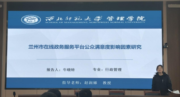 牛晓转同学的学术成果汇报从研究背景、研究思路、实证分析及对策建议等几个方面进行了阐述。她的研究发现,政务服务平台的公众满意度是成功构建一体化在线服务平台的关键要素,该文从公众视角出发,运用SPSS和AMOS分析了政务服务平台满意度影响因素,结果显示政府形象和感知质量对公众满意度具有正向影响,公众期望对公众满意度产生负向影响,尤其是当实际服务无法满足过高期望时,这种负向影响更加显著。