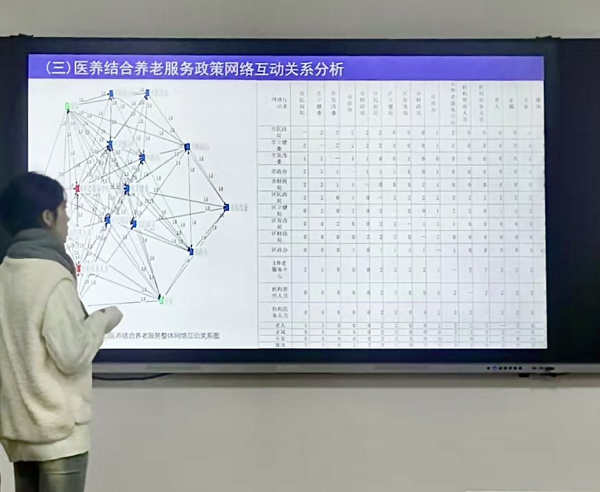 张等兄同学从研究背景、研究方法、研究结果、对策建议等几个方面汇报了自己的研究进展。她的研究发现在人口老龄化背景下,医养结合养老服务的政策网络优化的重要性。该文运用案例研究法、访谈法、社会网络分析法,以兰州市X 养老服务中心为例,构建出了X养老服务中心医养结合养老服务政策网络主体互动模式图。通过剖析互动模式图发现医养结合养老服务政策网络存在整体网络密度低、核心网络话语权集中、不同位置行动者互动关系不均衡以及边缘网络参与度弱等问题,并就这些问题给出了相应的对策。