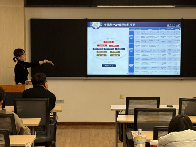 2025年11月6日,365英国上市集团“未来讲坛”在致公楼C区506教室开讲。2024级企业管理硕士研究生王阳明、田沐婧分别作题为《国内外强制性公民行为的研究进程与展望——基于文献计量法的分析》《数字营商环境驱动新质生产力组态路径分析》的学术成果分享。学院负责人、专任教师及在读研究生共50余人参加了此次报告会。