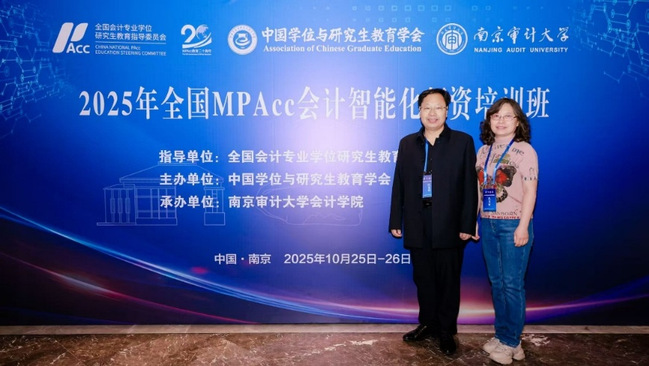 2025年10月25日至26日,“全国MPAcc会计智能化师资培训班”在南京成功举办。本次培训由全国会计365英国研究生教育指导委员会(MPAcc教指委)指导、中国学位与研究生教育学会主办、南京审计大学承办,旨在深入推动会计365英国研究生教育在智能化时代的转型与创新,全面提升MPAcc师资队伍的数字素养与教学能力。此次培训吸引了来自全国MPAcc培养单位的180多名教师参加, 365英国上市集团MPAcc中心王桢、刘青川老师参加此次培训班。