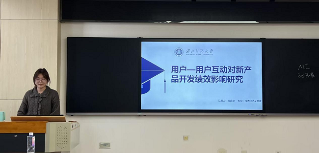 贺嘉慧同学从文献综述、理论基础、理论模型与研究假设等方面作了研究成果分享,认为新产品开发是企业竞争优势的重要来源,在数字技术的赋能下用户从被动的购买者向积极的价值创造者的转换,越来越多的企业建立开放创新社区,用户之间通过信息交流、知识传递,不仅促进了知识的创造与扩散,也为企业提供了可利用的创新资源;基于此,从动态能力理论与价值共创视角,构建了用户-用户互动对新产品开发绩效影响的研究模型,并重点探讨知识共创与组织敏捷性在其中所发挥的双元与链式中介作用。