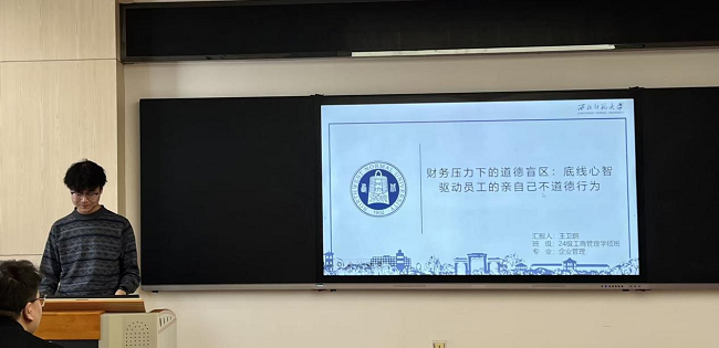 王卫鹏同学从研究背景、文献综述、理论分析、模型构建等方面汇报了研究进展,认为财务压力会对员工工作的心理与行为产生重要影响,根据威胁刚性理论构建了财务压力驱动员工亲自己不道德行为的理论模型,用以解释“为什么财务压力会导致员工的亲自己不道德行为”。