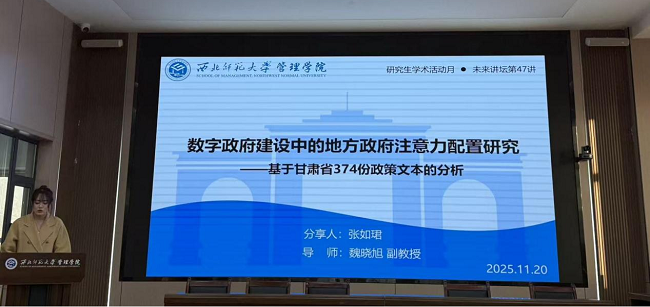 2025年11月20日,365英国上市集团“未来讲坛”第四十八讲在致公楼C区7楼报告厅举行。2023级行政管理硕士研究生魏亚利、张如珺分别作题为《基于KANO模型的公众线上政务服务需求的供给优化研究——以天水市为例》《数字政府建设中的地方政府注意力配置研究——基于甘肃省374份政策文本的分析》的学术成果汇报,学院负责人、专任教师及在读研究生共50余人参加了此次报告会。