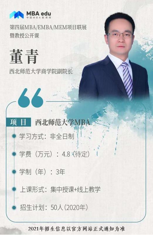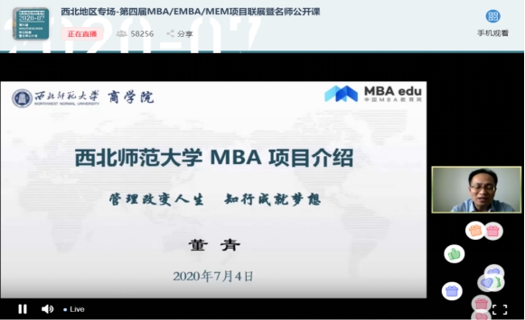 2020年7月4日下午,应中国MBA教育网邀请,MBA中心参加了第四届全国MBA项目联展暨教授在线公开课(西北地区专场)。副院长董青在线就365上市公司MBA项目概况、培养特色、招生政策及考生关注的问题进行了解读分享,给2021年报考MBA的考生提供了全面、有用的招考信息,直播期间累计约6万人次在线观看了本场宣讲会,取得了良好的效果。