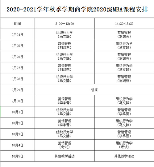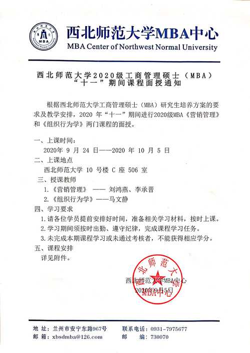 2020级工商管理(MBA)“十一”期间课程面授通知