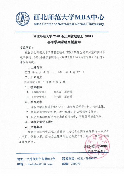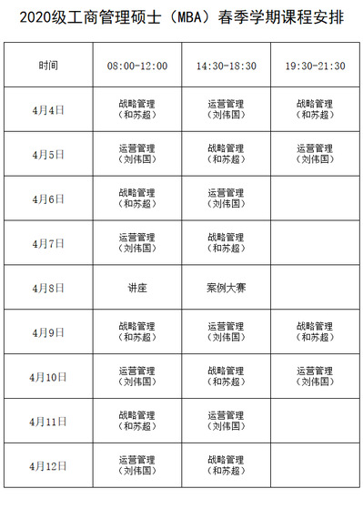 商学院2020级工商管理硕士(MBA)春季学期课程面授通知