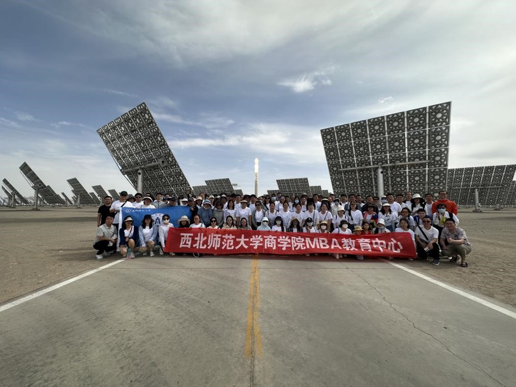 2023年7月6日,在商学院党委书记马科中、副院长何迎朝及MBA教育中心工作人员、专任教师的带领下, 110余名2021级、2022级MBA学生参观了位于大漠戈壁之上、目前国内最大的光伏发电示范基地——“敦煌光电产业园”。首先,学员们参观了该工业园区的数字展厅,在讲解员的带领下详细、全面地了解了光伏发电的原理、设施、设备、工业园区的建设里程等。