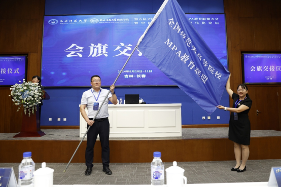 闭幕式由东北师范大学政法学院副院长刘桂芝教授主持。东北师范大学政法学院院长李红权教授作大会总结发言,他希望全国师范类高等院校能够以“师”之名,并肩同行,共谋发展,共创佳绩。华南师范大学颜海娜教授代表第六届全国师范类高等院校MPA教育联盟大会承办单位作表态发言,并进行会旗交接仪式。