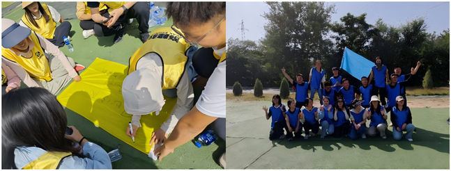 同学们被随机分为六组,各组队员要在短时间内熟记彼此姓名,并共同设计队旗与口号。通过“姓名记忆挑战”迅速打破同学间初识的隔阂,而队旗和激昂的口号迅速点燃了团队热情,为后续活动奠定了信任基础。